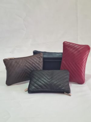 Monedero de piel de vacuno con dos cremalleras la parte de delante lleva un dibujo con pespuntes y en la de atrás tiene un bolsillo con cremalleras. El interior esta todo forrado y las medidas son de 14 cm. x 10 cm.